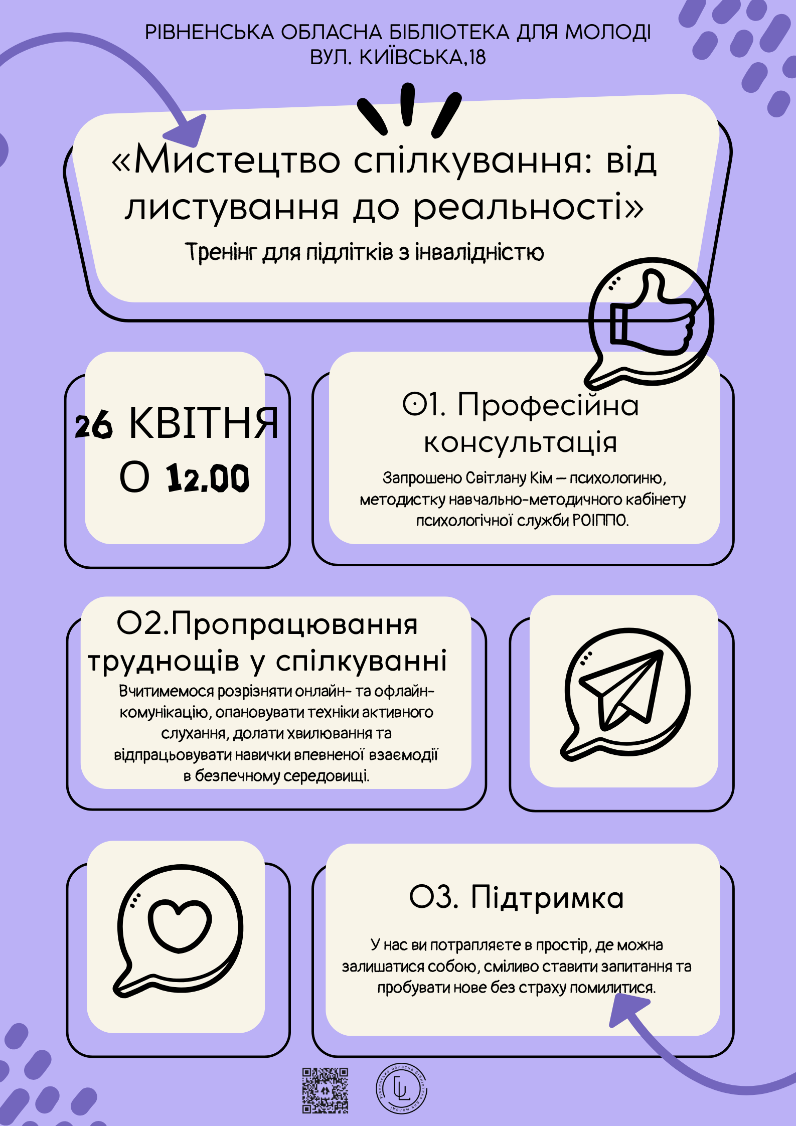 Рівненська обласна бібліотека для молоді 14.04 о 17:00 – Клуб розмовної англійської мови «English Speaking Club» з Євгенією Макарчук (Молодіжний простір «НОТА») 15.04 о 10:00