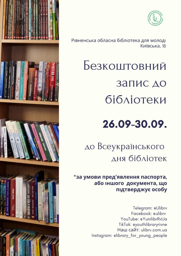 📚🇺🇦 Друзі, з нагоди нашого професійного свята – Всеукраїнського дня бібліотек (30 вересня) оголошуємо безкоштовний запис до Рівненської обласної бібліотеки для молоді!