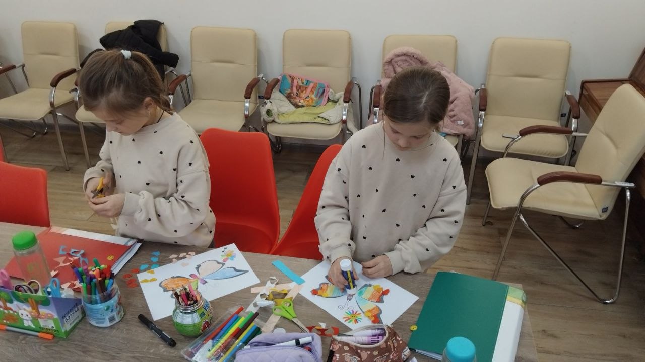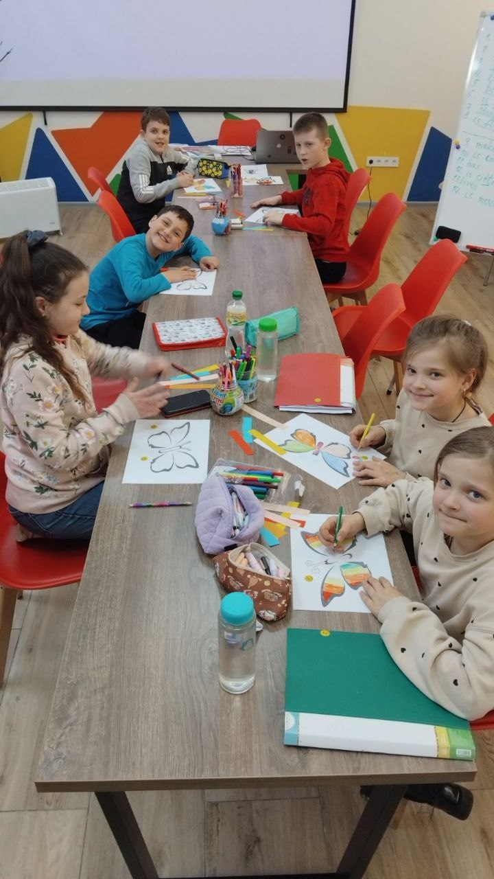 На творчій частині заняття виготовляли яскравих 3D-метеликів, використовуючи шаблони, кольоровий папір, наклейки, клей, олівці та фломастери