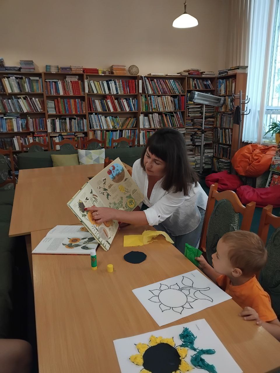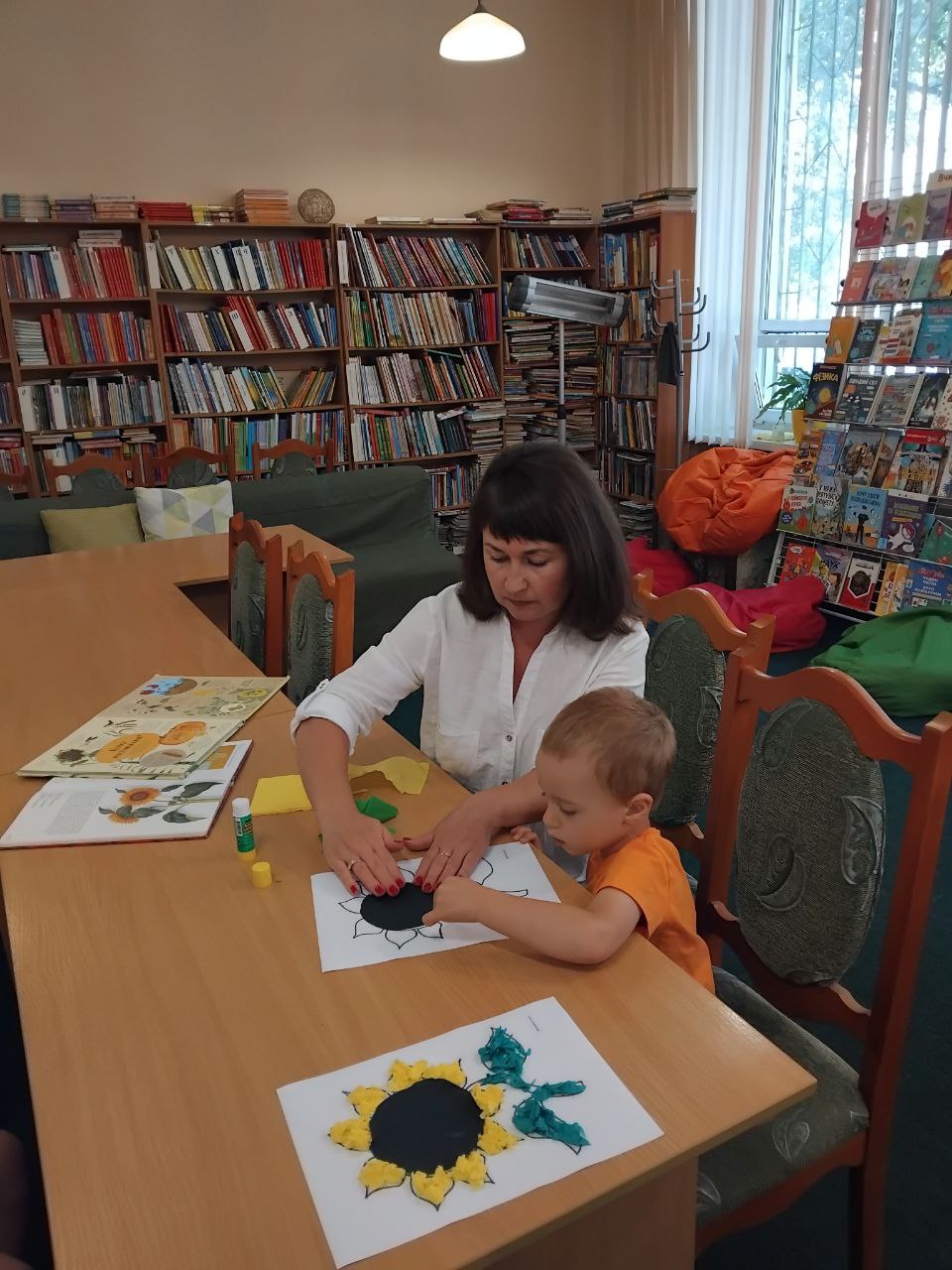Сьогодні на занятті у клубі раннього розвитку “Мамине сонечко” у відділі сімейного читання найменші користувачі створювали аплікацію “Соняшник”, знайомилися з будовою квітки та вчилися передавати ії красу.