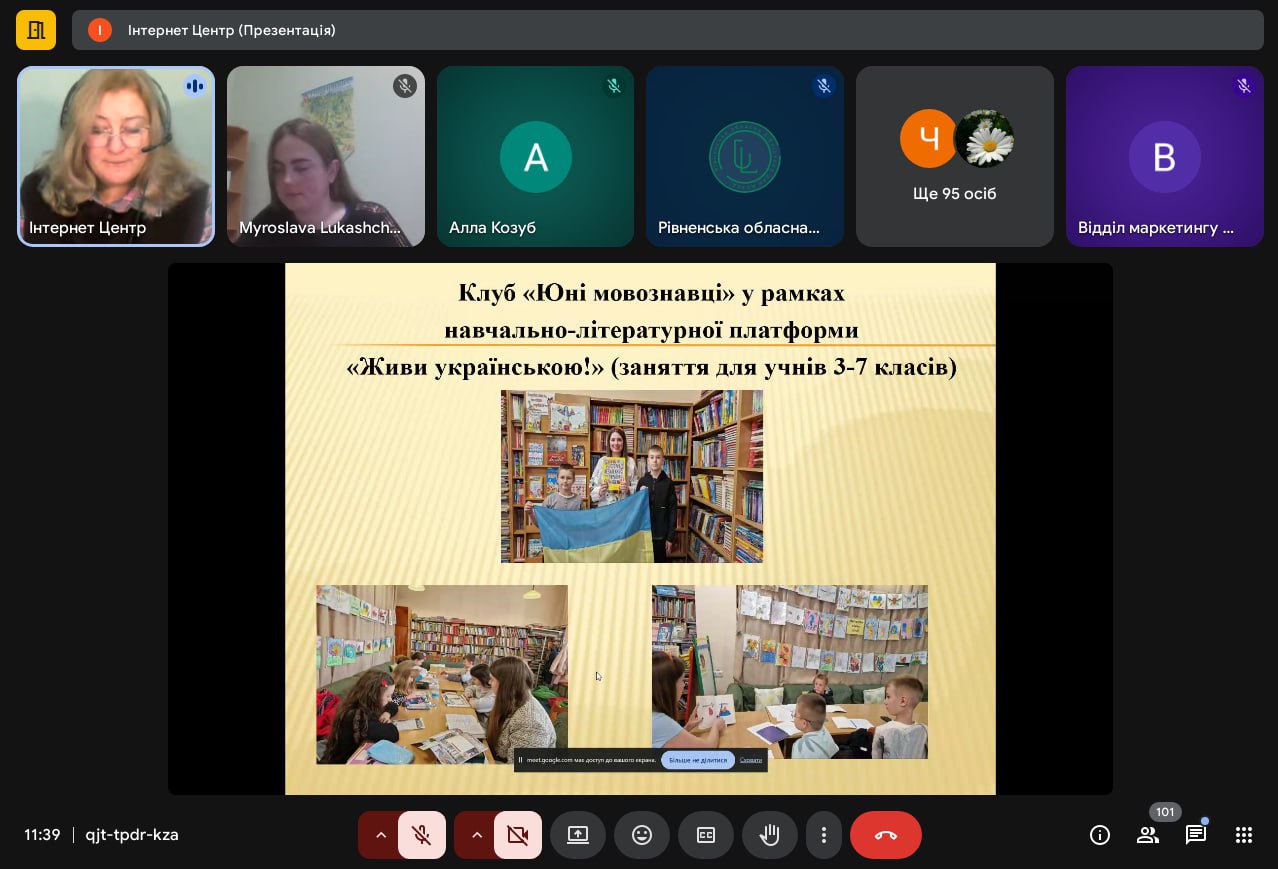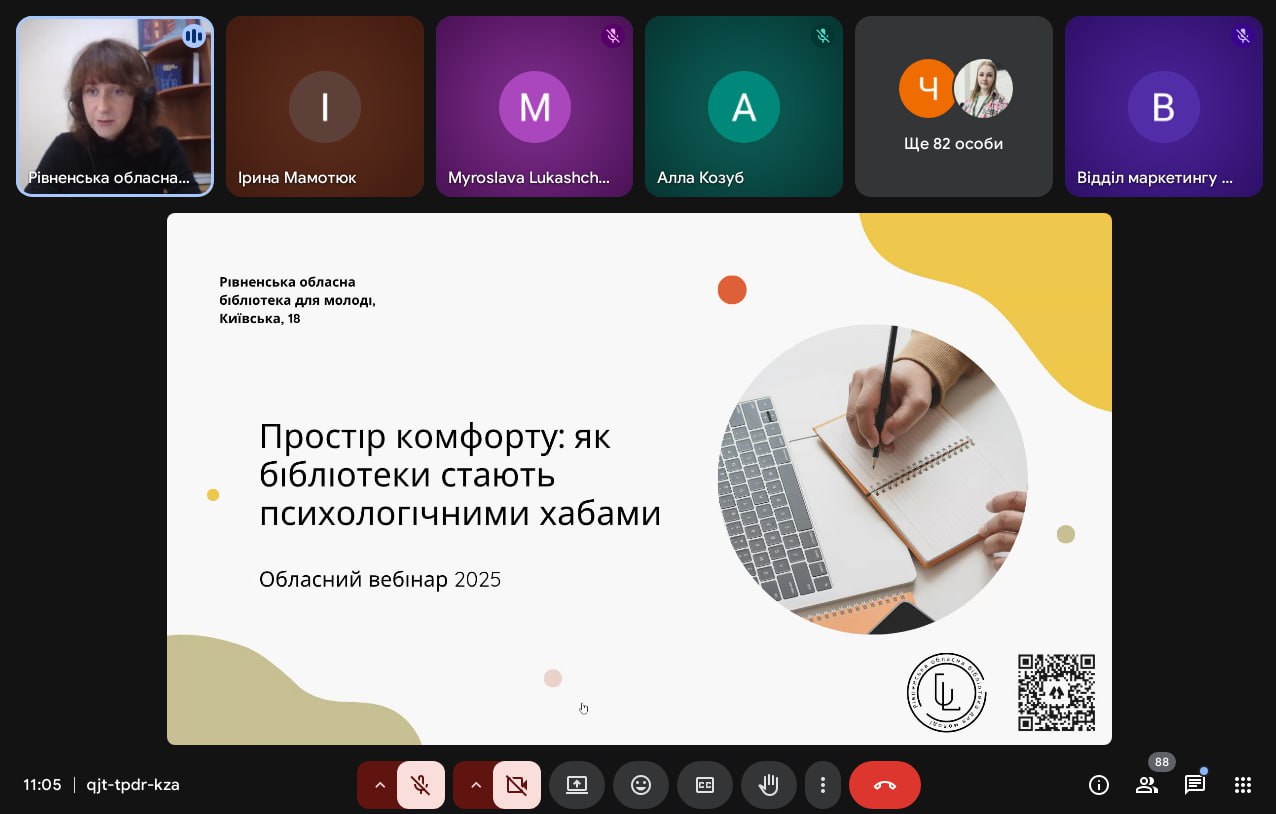 Рівненська обласна бібліотека для молоді провела фаховий обласний вебінар для бібліотечних працівників Рівненщини. 118 учасників зібралися на платформі Google Meet, щоб обговорити актуальну тему – роль бібліотеки як психологічного хабу, місця підтримки, розвитку та відновлення для громади, а також познайомитися з кращими практиками роботи Рівненської молодіжної бібліотеки.