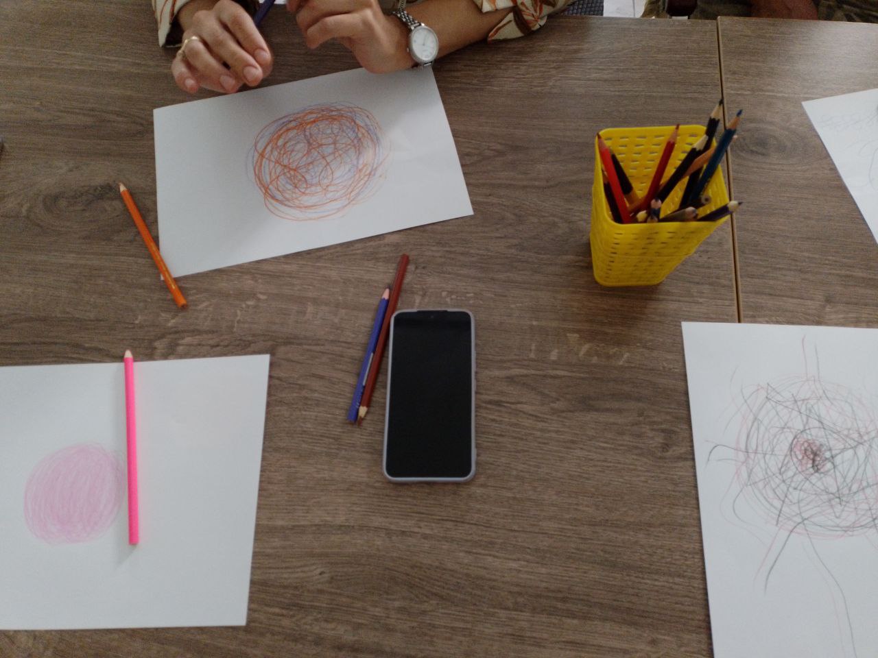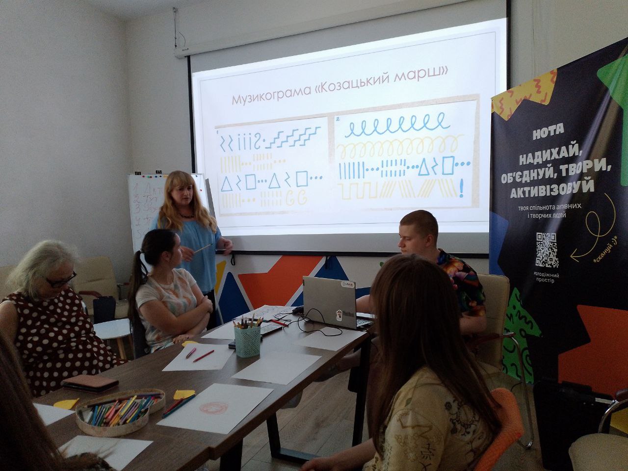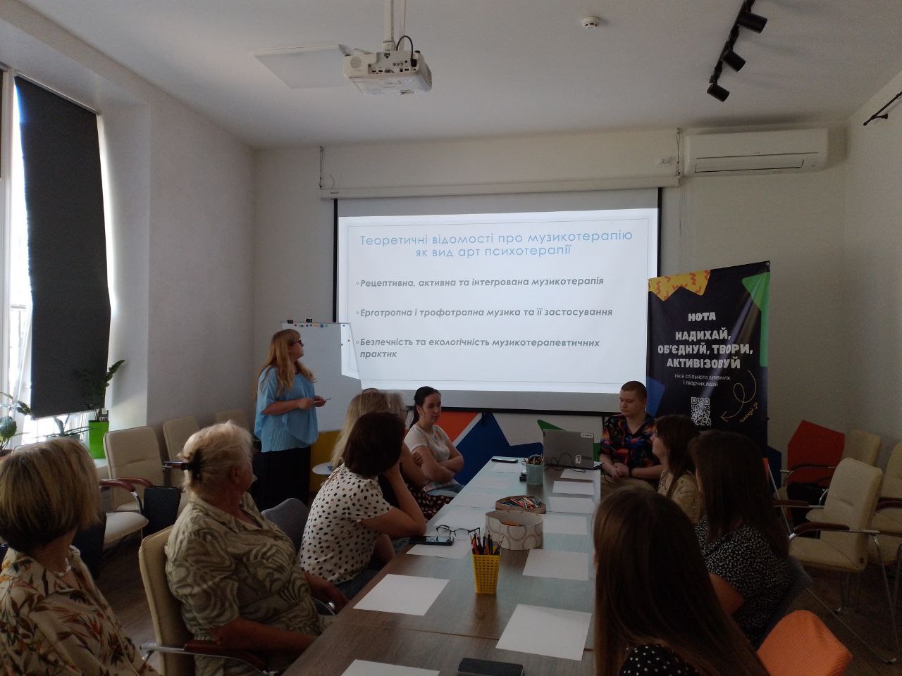 У практичній частині тренінгу Світлана Фостій познайомила учасників з різними методами музикотерапії. Вони випробовували різні техніки та вправи, які допомогли працювати з емоціями та стресом. Окрему увагу приділили роботі з музикограмою та вправою, що передбачала використання звуків тіла – плескання, шурхотіння, тертя та клацання. Усі сьогоднішні вправи вправи активізували роботу обох півкуль мозку, сприяли більш глибокому розумінню власних переживань та методів їх подолання.