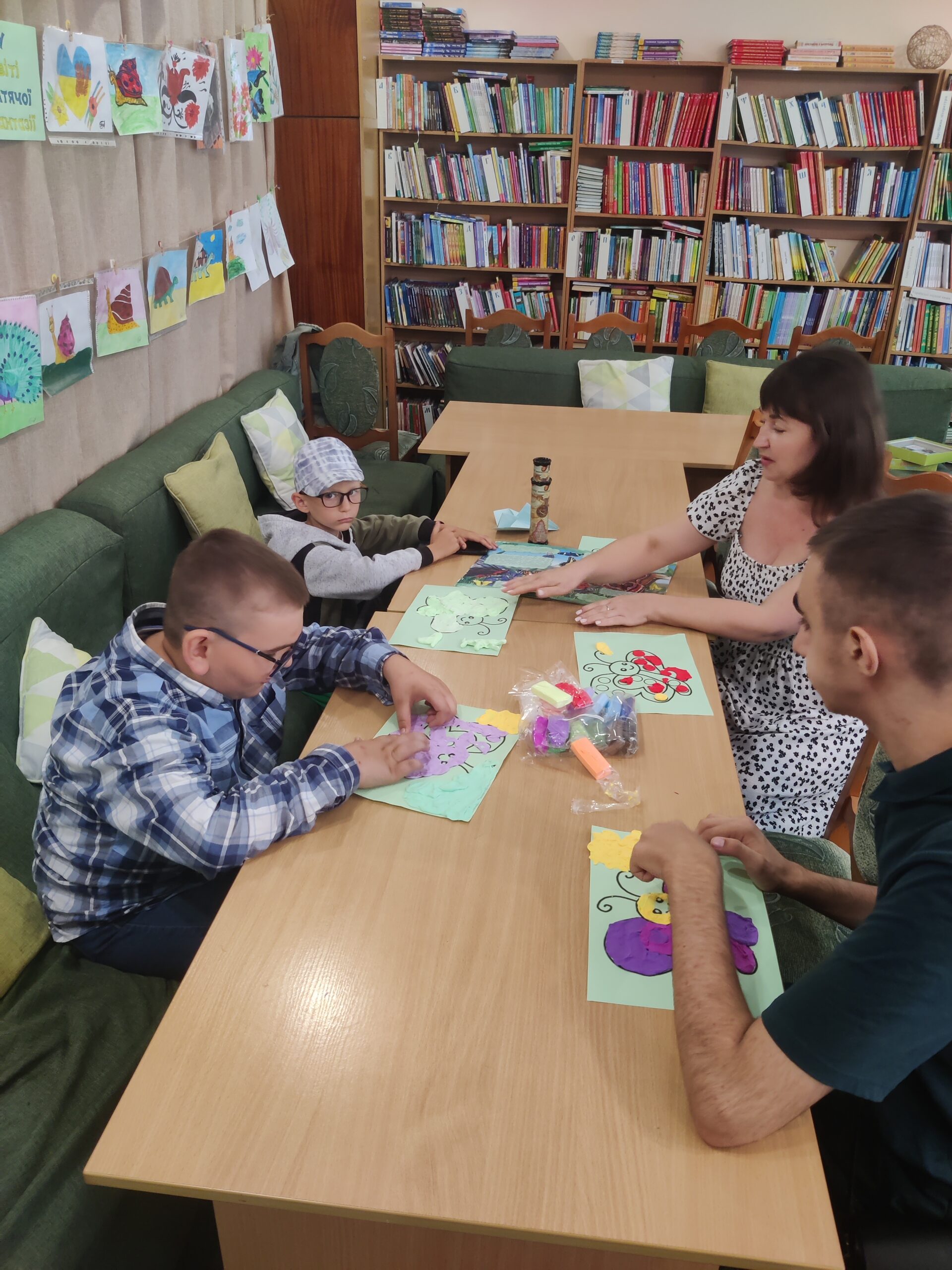 Тим часом діти учасників разом з провідним бібліотекарем Наталією Чукань працювали над аплікацією «Метелик»