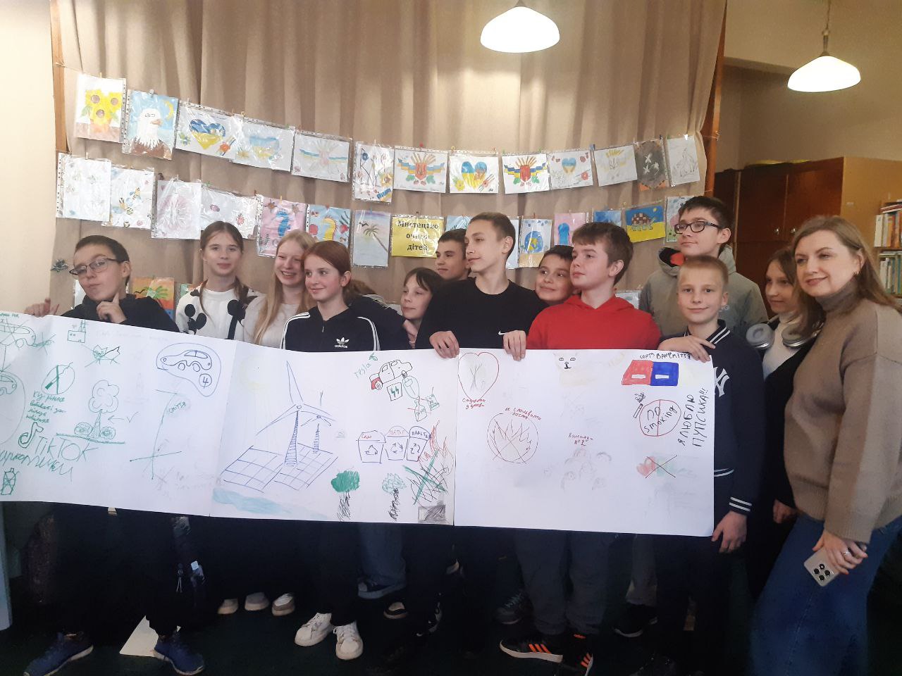 Кульмінацією зустрічі стало створення яскравих плакатів – на них діти зобразили свої ідеї та бачення, як врятувати екологію. Серед малюнків – як серйозні екологічні проблеми (спалене листя, куріння, засмічення природи), так і кумедні дитячі фантазії про «екологічне зло»: наприклад, люди, які зображають із себе тварин – квадробери, що, за версією учнів, теж шкодять довкіллю