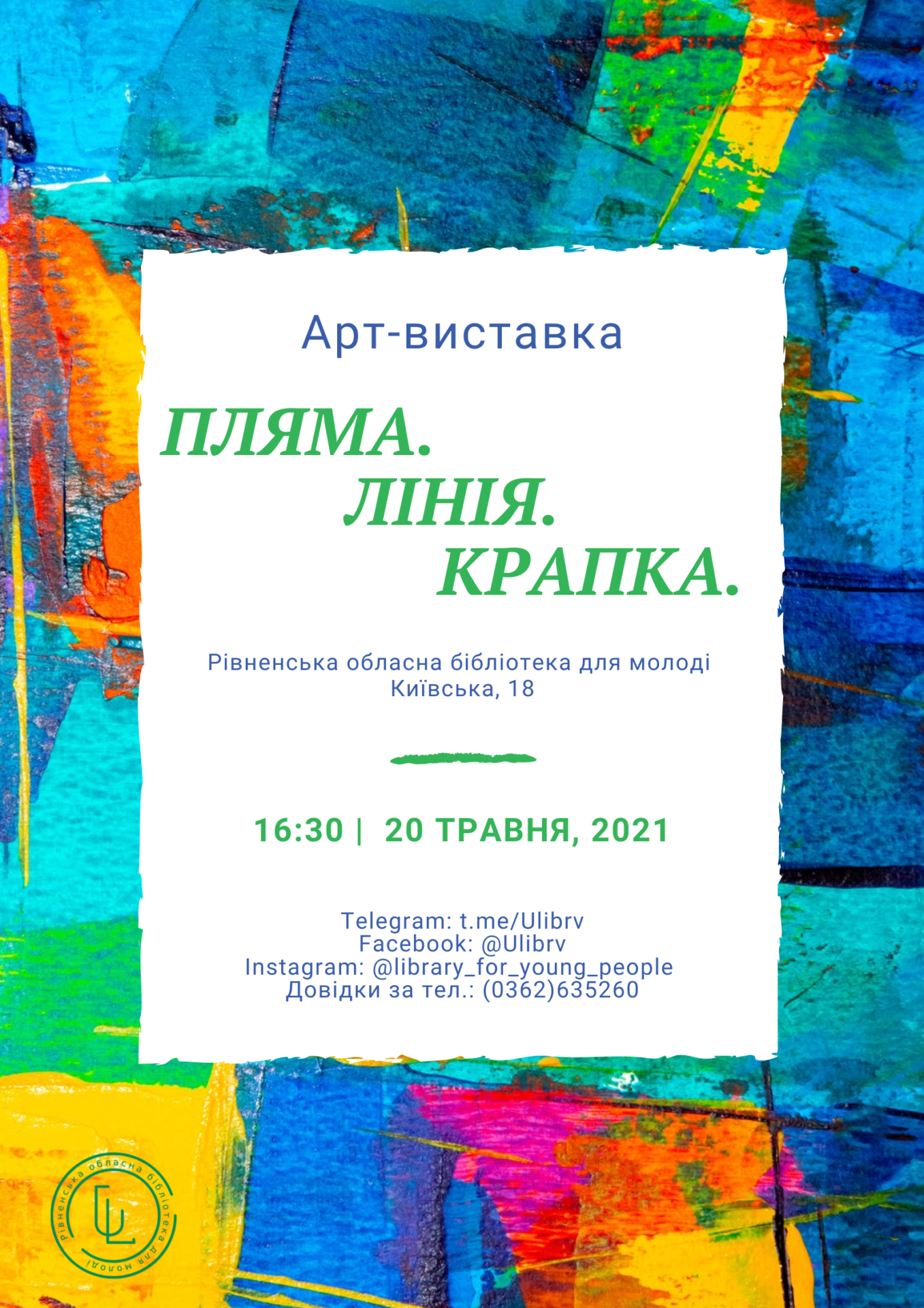 Друзі, 20 травня о 16.30 запрошуємо вас на відкриття арт-виставки “Пляма. Лінія. Крапка” до Рівненської обласної бібліотеки для молоді, Київська, 18. На вас чекатиме багато