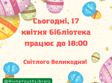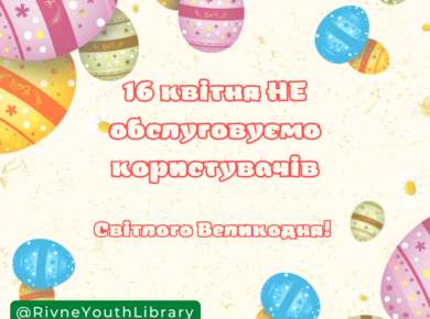 Шановні користувачі, звертаємо Вашу увагу, що 16 квітня у Рівненській обласній бібліотеці для молоді обслуговування користувачів не буде здійснюватися. Світлого Великодня!