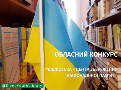 Рівненська обласна бібліотека для молоді розпочинає прийом матеріалів обласного конкурсу «Бібліотека – центр збереження національної пам’яті» серед працівників бібліотечних закладів та центрів культурних послуг. Метою