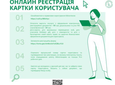 Дорогі читачі! 😊 Нагадуємо вам, що з нового року у нас розпочалася перереєстрація користувачів. Запрошуємо до бібліотеки! 🥰 Вартість оформлення реєстраційних документів становить 50 гривень,