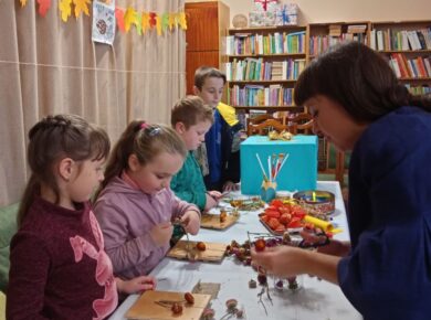 Вчора у відділі сімейного читання відбулося друге заняття у студії дитячої творчості “Твій подарунок”.Осінь у мішечку на паркані! Ось таку красу виготовляли діти під час