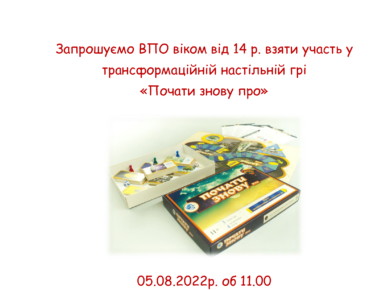 🧐📑 5 серпня о 11:00 запрошуємо ВПО віком від 14 р. взяти участь у трансформаційній настільній грі «Почати знову про».🧐📑 Запис за номером 0960325489 (кількість