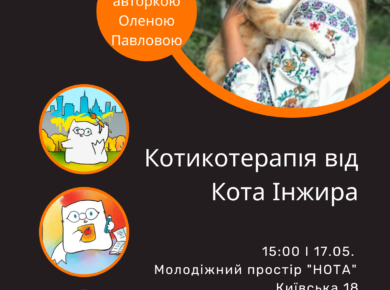 17 травня о 15:00 у МП «НОТА», що функціонує на базі Рівненської обласної бібліотеки для молоді (Київська, 18) відбудеться зустріч-майстерклас «Котикотерапія від кота Інжира» спільно