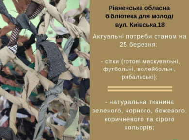 ✅ На сьогодні волонтерський штаб має нагальну потребу у: 🔻 сітках (готові маскувальні, футбольні, волейбольні, рибальські);🔻 натуральній тканині зелених, чорних, бежевих, коричневих та сірих кольорів;