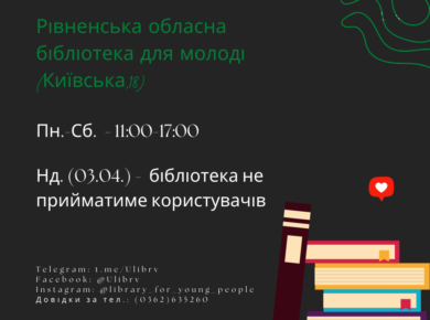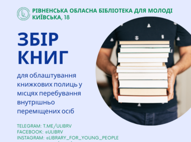 Рівненська обласна бібліотека для молоді оголошує збір книг для облаштування книжкових полиць у місцях перебування внутрішньо переміщених осіб. Збір книжок для дітей та дорослих проводиться