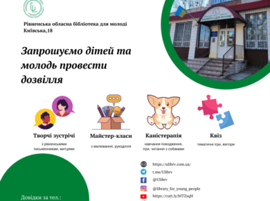 Рівненська обласна бібліотека для молоді запрошуємо дітей та молодь з числа внутрішньо переміщених осіб із зони бойових дій відвідати: · творчі зустрічі з місцевими письменниками та митцями; · майстер-класи з