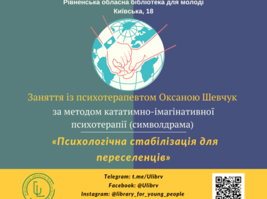 30 березня о 14:30 запрошуємо на зустріч «Психологічна стабілізація для переселенців» із сертифікованим психотерапевтом Оксаною Шевчук. Заняття для дорослих по стабілізації психічного стану за