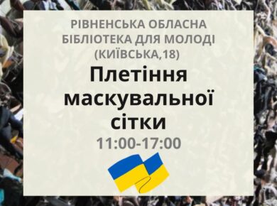 Друзі, продовжуємо та знову запрошуємо охочих на плетіння маскувальної сітки до бібліотеки (Київська,18) з 11:00 завтра 6 березня 🙏💙💛 📌Нагадуємо, що на базі Рівненської обласної