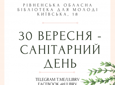 Дорогі читачі, повідомляємо, що 30 вересня бібліотека не прийматиме користувачів, а 1 жовтня працюємо у звичному режимі. Чекаємо на вас!