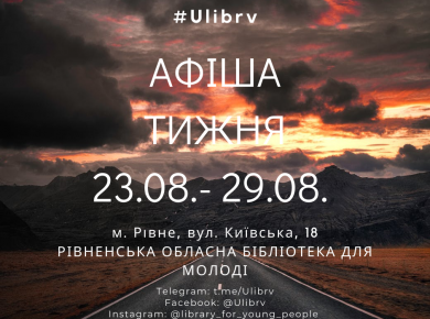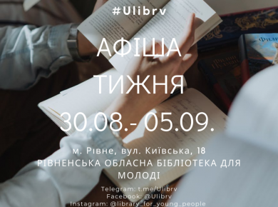 АФІША ТИЖНЯ 30/08 – 05/09 Запрошуємо до молодіжної! Вiвторок, 31 серпня, 17:00 Лінгвістична студія «English Speaking Club» Місце проведення: читальна зала Вівторок, 31 серпня, 17:00