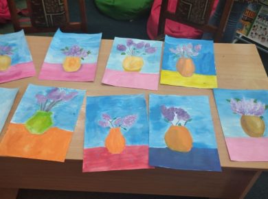 Заняття у бібліотечному арт-класі “Кольорові пальчики” . Цього разу темою став квітучий травневий букет бузку, який учні виконали гуашшю Результати дуже гарні, правда ж